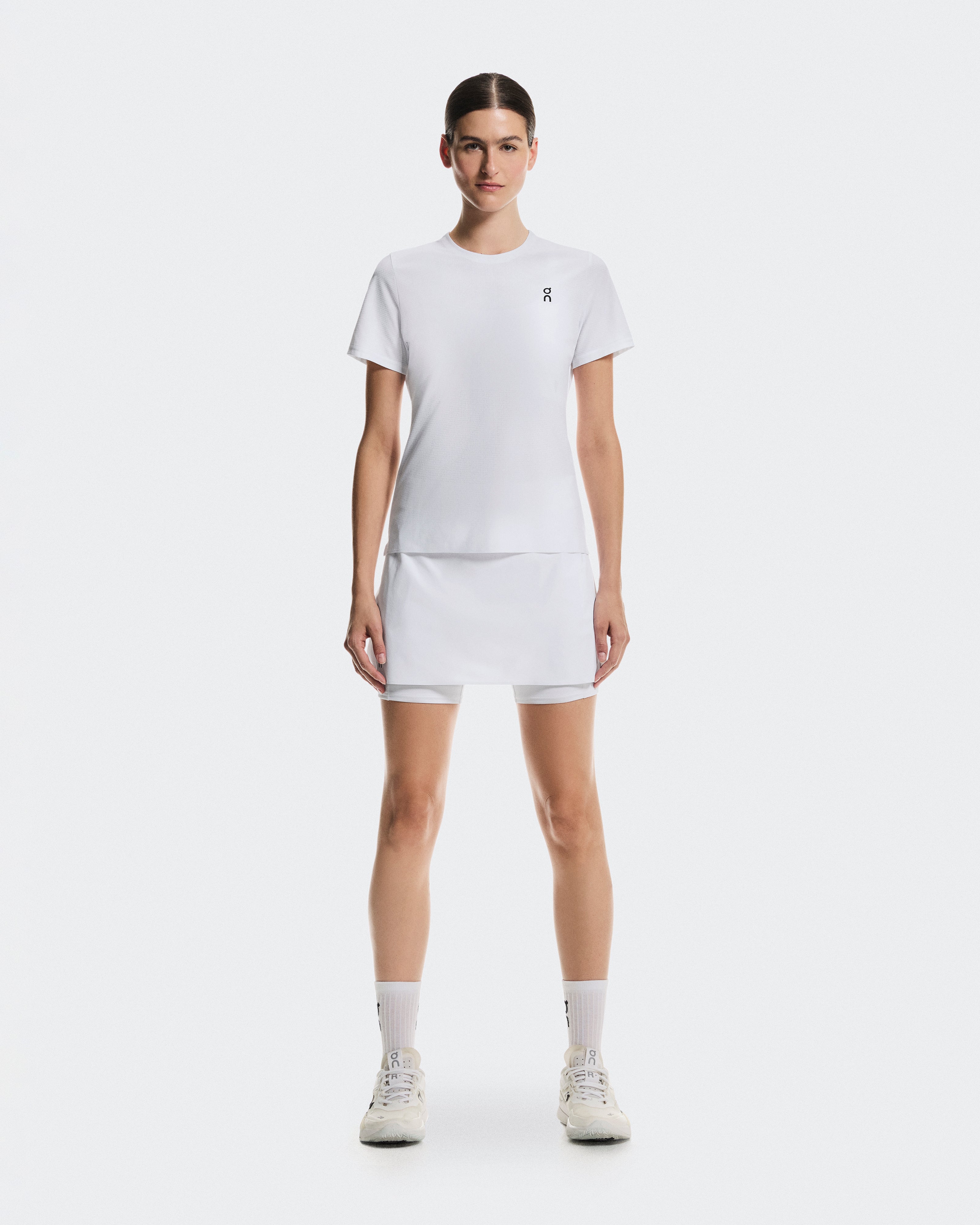 A breathable tennis skirt with a side split, a mesh-lined waistband, and built-in inner tights with mesh ball pockets.